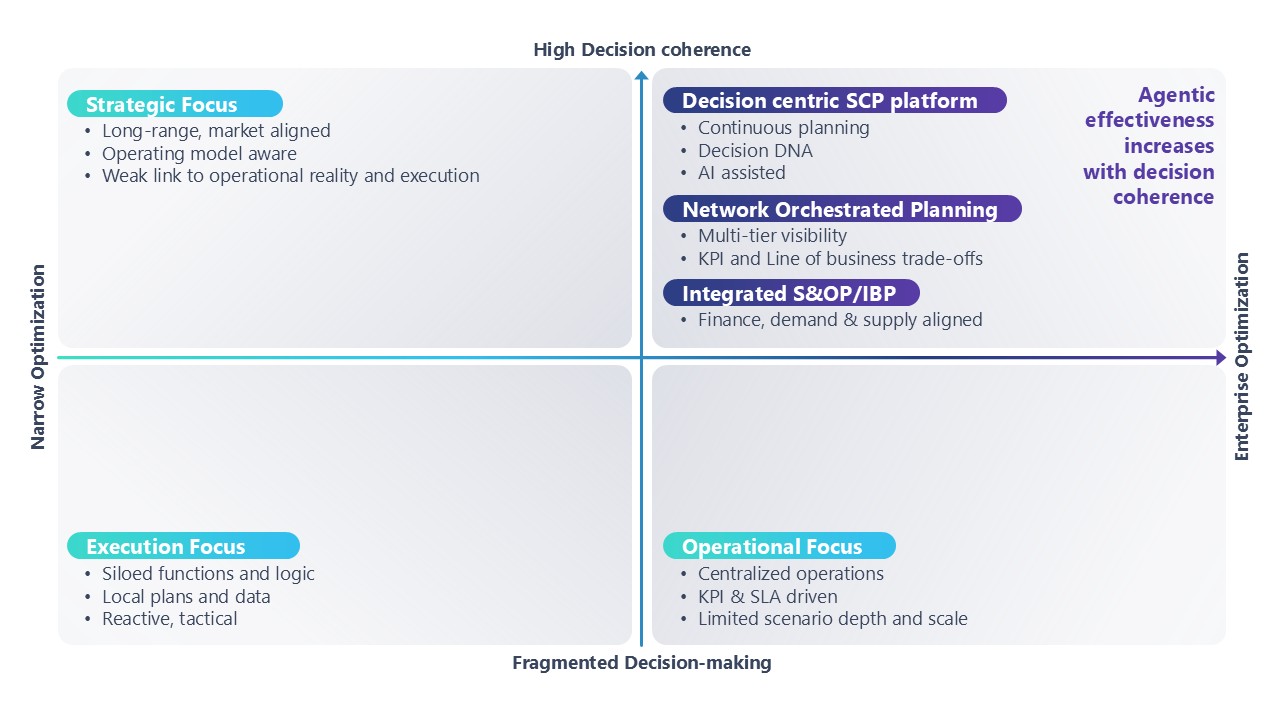 Critically, the effectiveness of agentic capabilities is determined by where an organisation sits on the decision archetype grid. In fragmented or control-tower–led environments, agents tend to accelerate local reactions without resolving underlying trade-offs. In enterprise-aligned models—particularly where S&OP and IBP provide shared assumptions and governance—they help sustain decision quality under volatility.