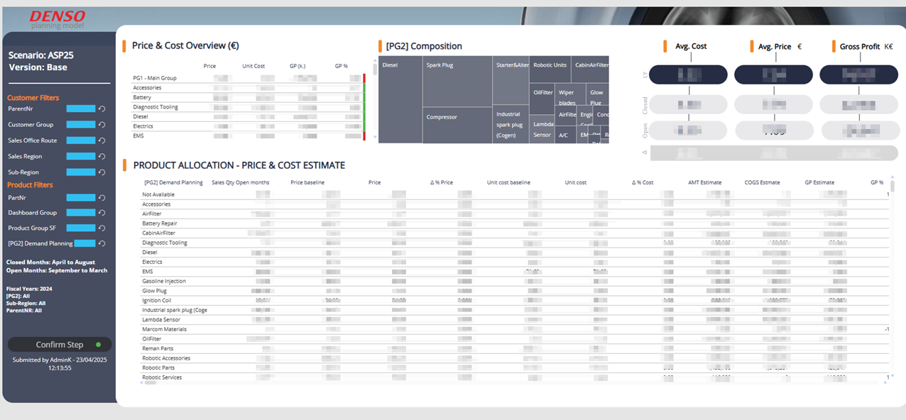 Planning is carried out at the product group level, with full drill-down capabilities across multiple dimensions, right down to individual SKUs and customer accounts. Users can review and adjust planned volumes while managing related pricing and cost data to ensure precise sales and COGS calculations. This multidimensional approach enhances accuracy and enables tighter alignment with both Supply Chain constraints and Financial requirements.